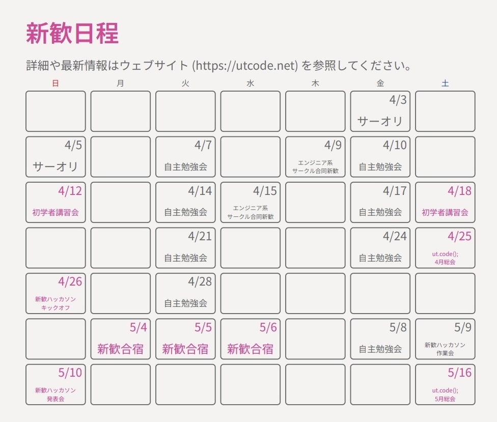 ut.code(); の普段の活動を知ることができますし、部員や他の新入生とも交流できるいい機会になります! ぜひご参加ください!